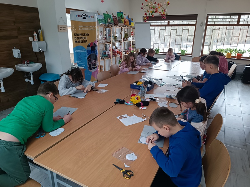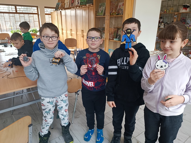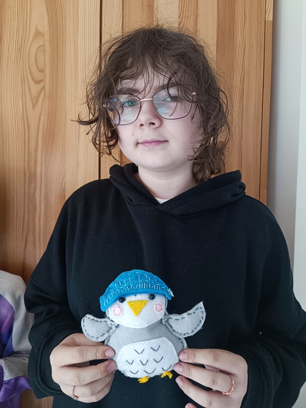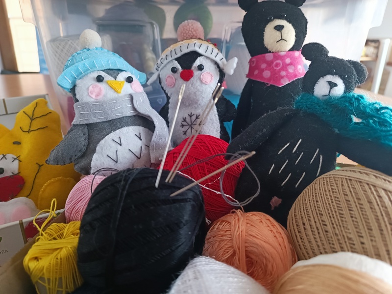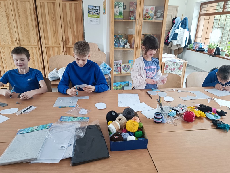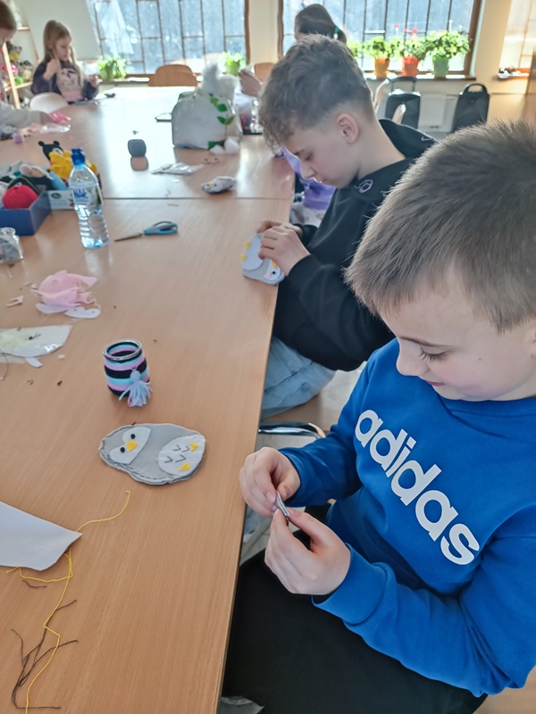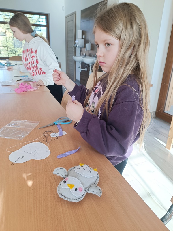 zajęcia kreatywne – filcowe zabawki DIY – podczas drugiego spotkania dzieci kończyły szyć swoje wyjątkowe maskotki, które rozpoczęły w pierwszym tygodniu ferii. Powstały piękne, kolorowe i w pełni autorskie prace, które uczestnicy z dumą zabrali do domu